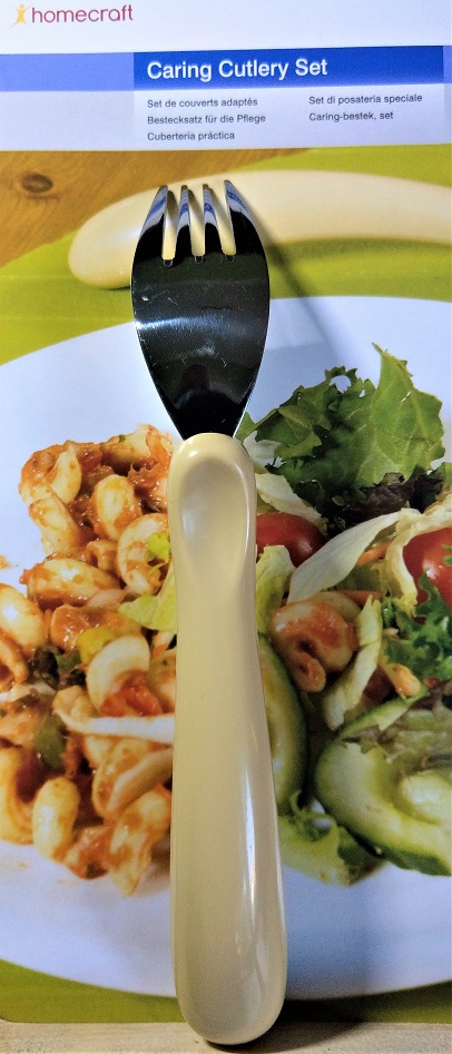 Caring Cutlery Fork from Homecraft is designed for weak grip hands, moulded into contoured beige plastic handles with built-up ends.