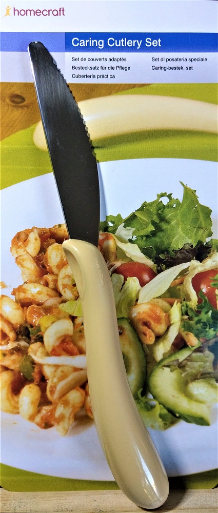 This cutlery is specifically designed for those with weak hand grip and restricted wrist or finger movement. The knife has a serrated blade to assist with cutting. The knife and the fork have a shaped indent on the top for the index finger to help with directional control.