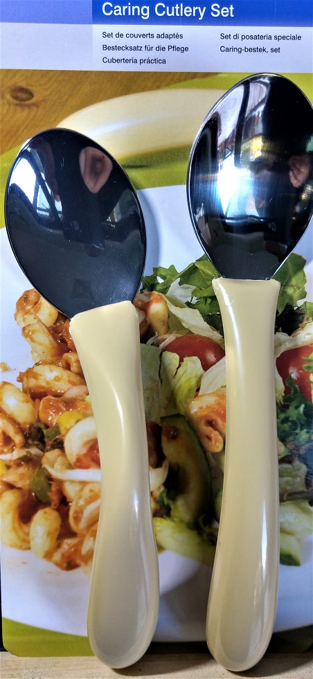 Caring Cutlery Right Angled Spoon is designed for weak grip arthritic hands and to reduce the wrist or hand movement, required to bring the food to the mouth. It is moulded into contoured beige plastic handles with built-up ends.