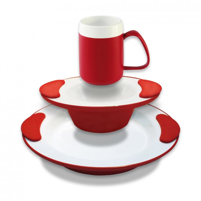 A range of red and white contrasting tableware designed to stimulate the appetite and help people more easily see their food or drink due to the colour contrasting rims. Each piece is designed for maximum functionality and ease of use, making it easy for anyone with cognitive impairment or other mobility limitations to dine with dignity and independence.