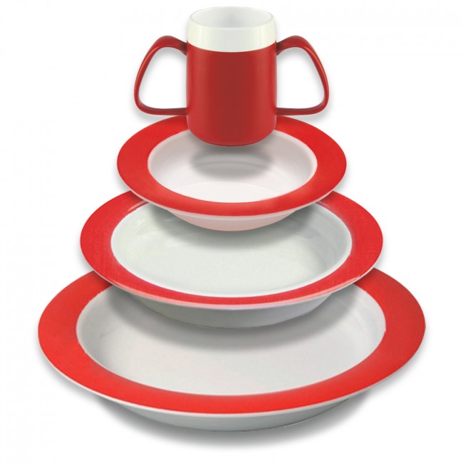 A range of red and white contrasting tableware designed to stimulate the appetite and help people more easily see their food or drink due to the colour contrasting rims. Each piece is designed for maximum functionality and ease of use, making it easy for anyone with cognitive impairment or other mobility limitations to dine with dignity and independence.