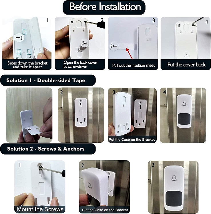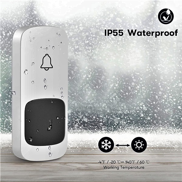 Withstands various harsh weather conditions; Easy to Install - 1. Wireless no batteries required plugin door bell chime; 2. Mount the remote door button (battery powered) by sticky pad or anchors & screws.